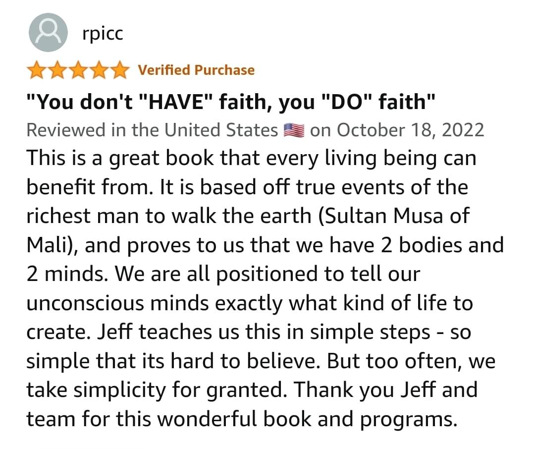 I read, with spell binding fascination, about the near death experience Musa had at the age of twelve wherein he met a man made of light who taught him how the world works. By employing the principles in Musa’s writings, my life changed dramatically, rapidly and all for the better!